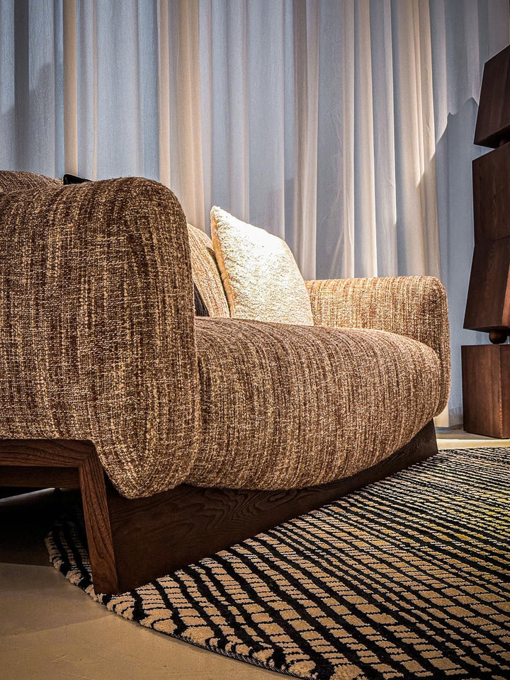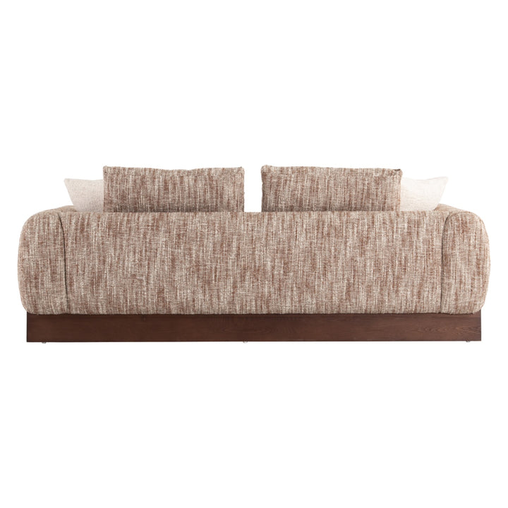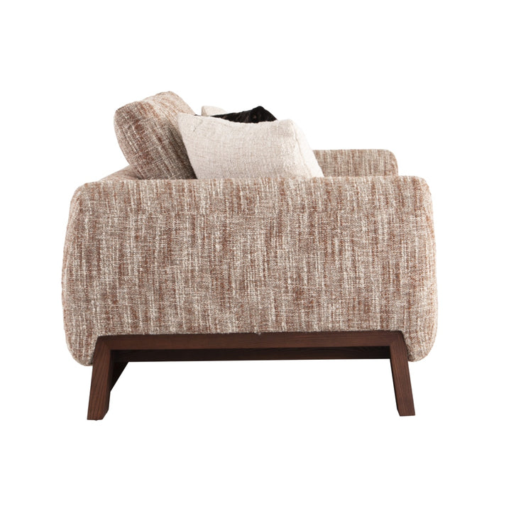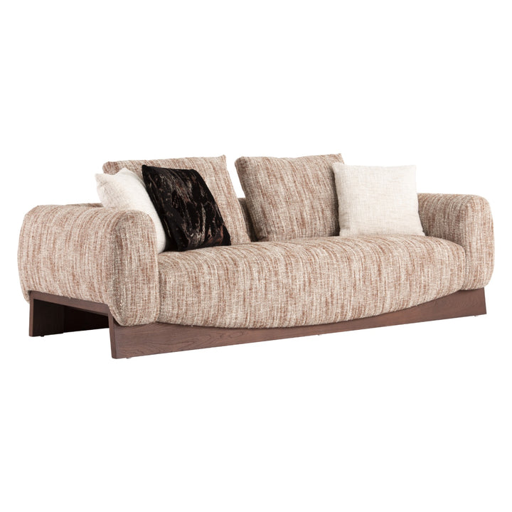 Blending comfort with craftsmanship, this wooden base sofa features high-quality cotton-linen fabric, plush down-filled seat cushions, and high-density foam for supportive seating. Built with imported larch wood, its base showcases natural elm wood veneer over multi-layer solid wood panels in a warm walnut finish. A refined, durable piece perfect for elevating any modern or classic interior.