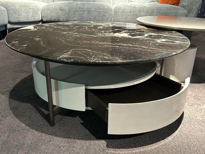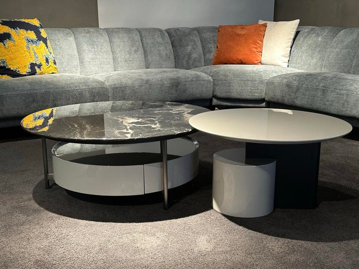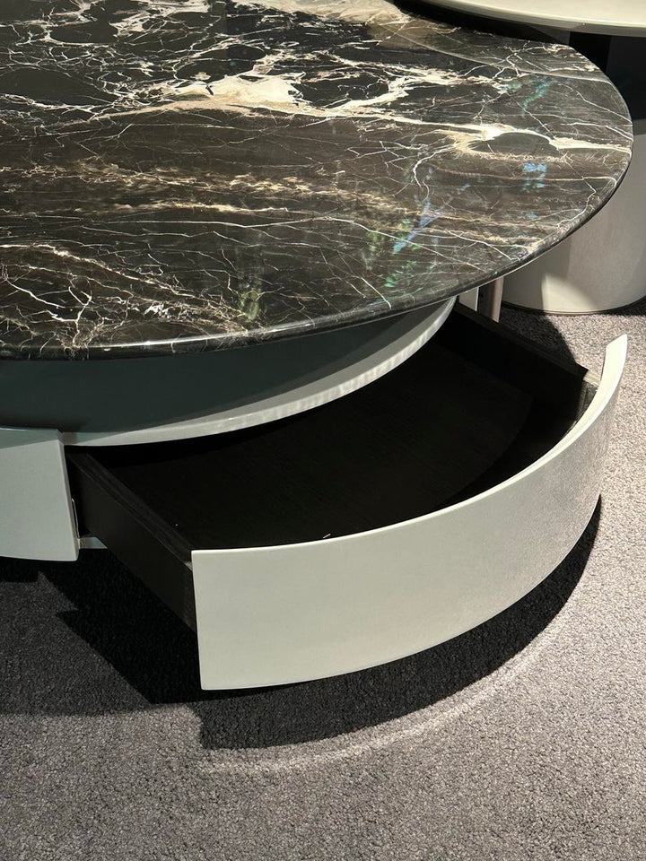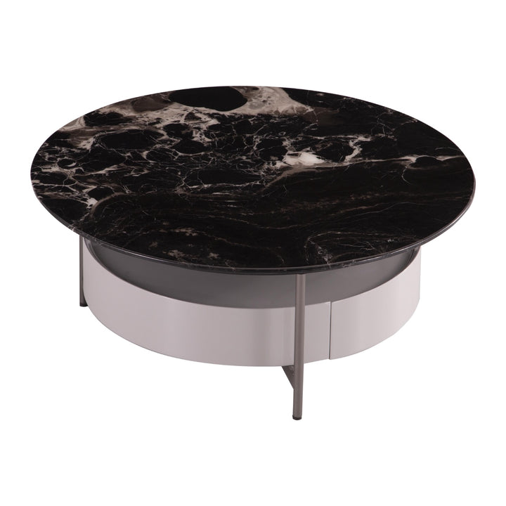 This round marble coffee table features an elegant E1-grade high-density board finished in glossy silver-titanium grey lacquer. The brushed stainless steel base is electroplated in matte grey titanium for a sleek, modern touch. Topped with natural marble, it combines luxury and durability—perfect for contemporary living spaces seeking refined sophistication.