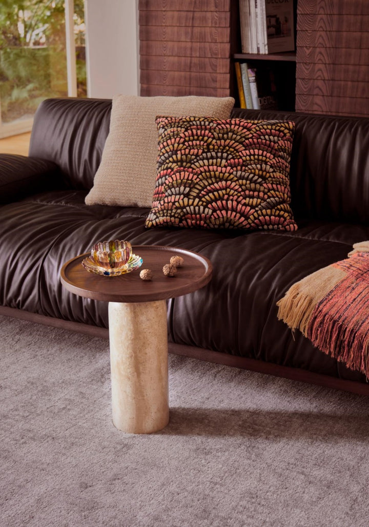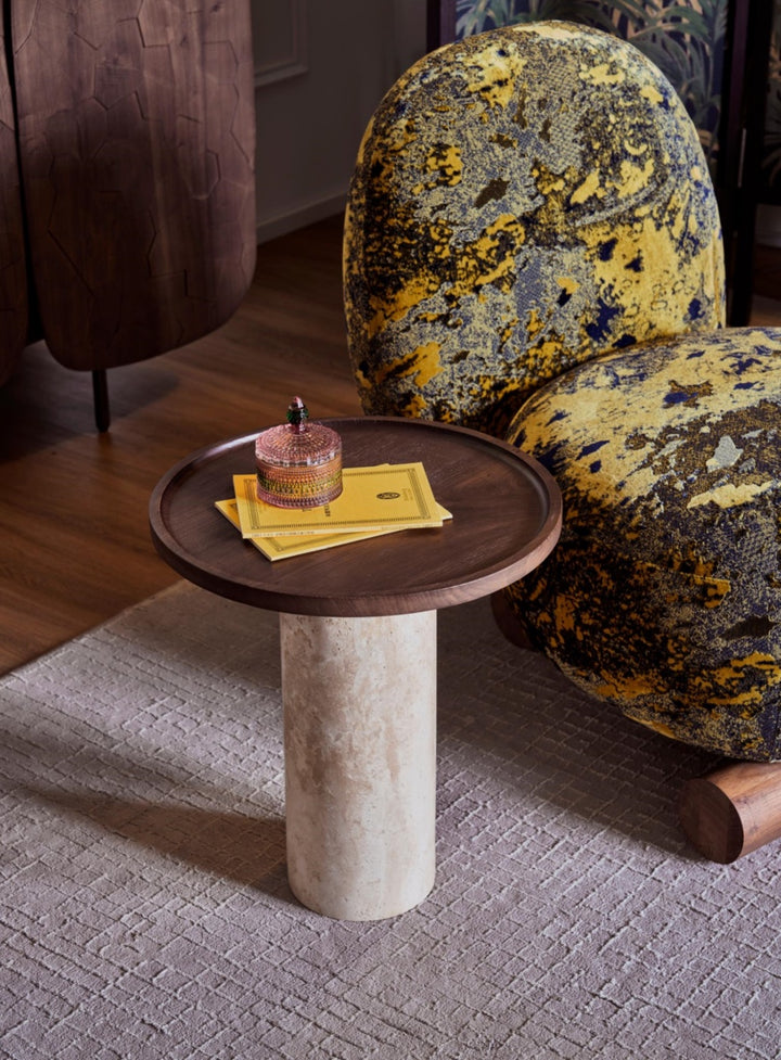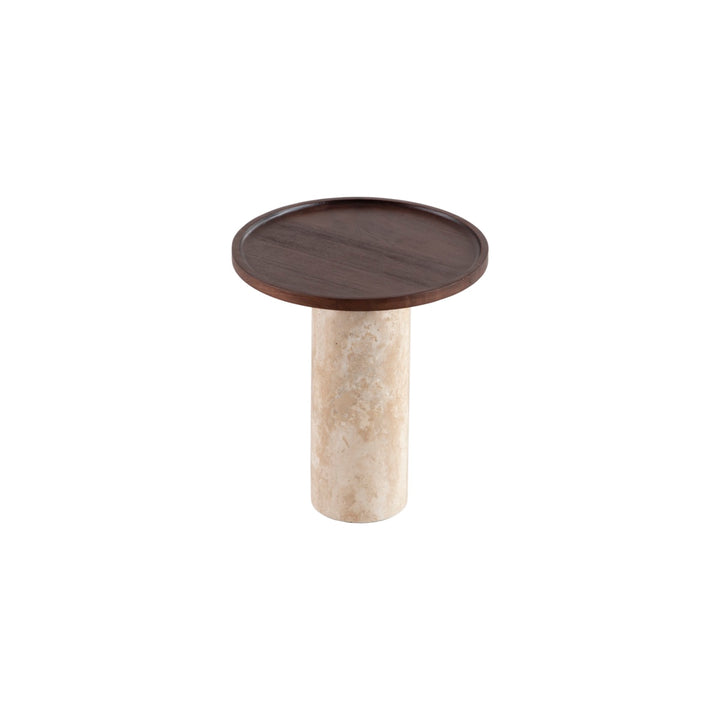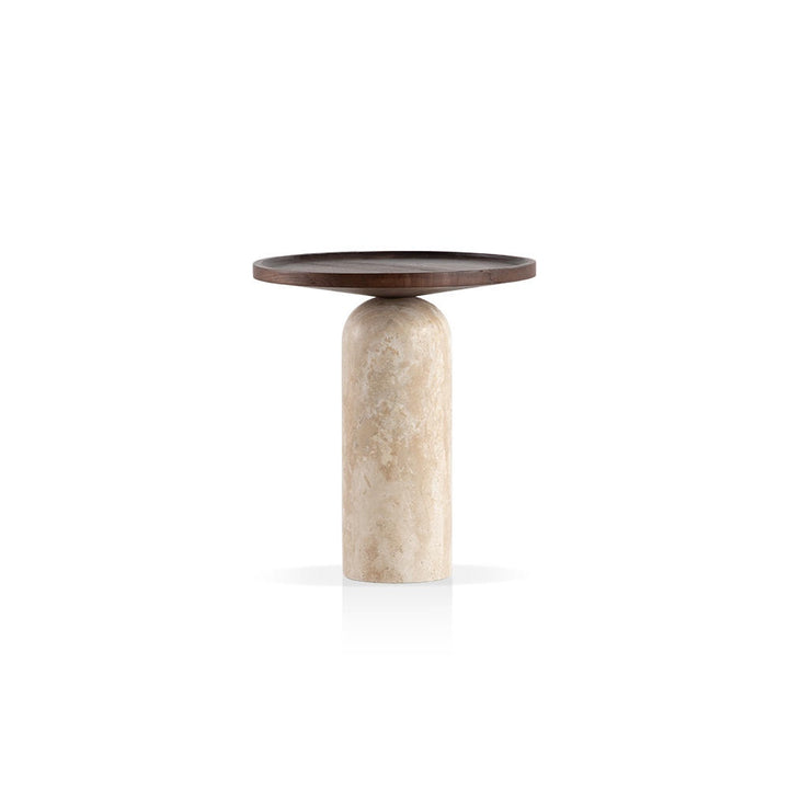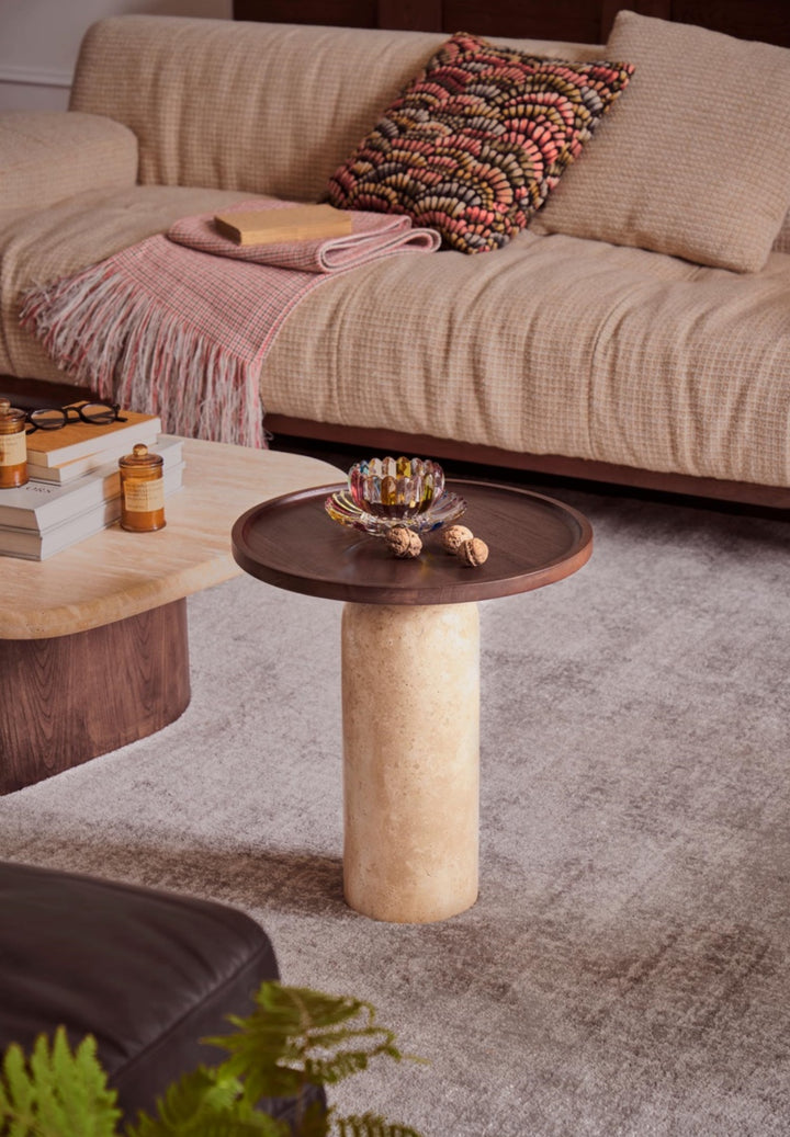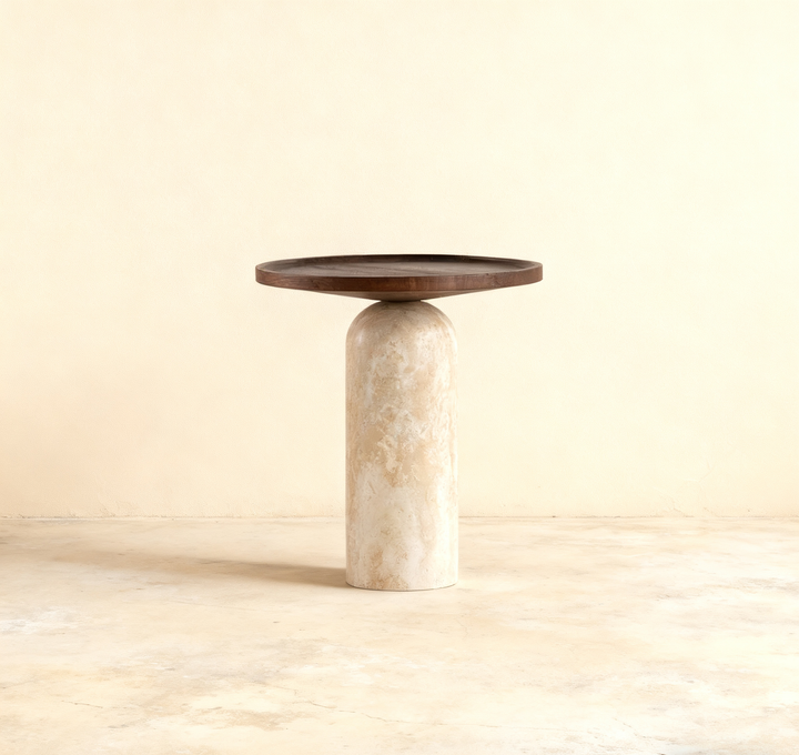 This distinctive coffee table features a weathered elm wood top finished in rich walnut tones, offering warmth and character. The solid travertine base provides natural elegance and sturdy support. A refined blend of organic textures and timeless design, perfect for elevating modern or rustic-inspired living spaces.