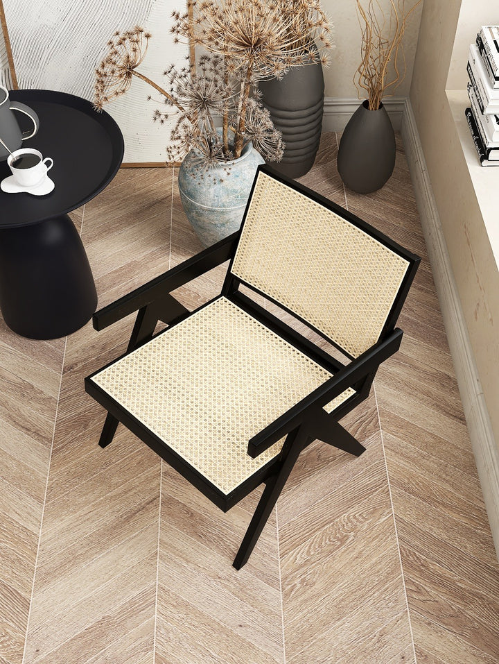 椅子的座椅和靠背由真藤製成,為椅子的設計增添了獨特而優雅的元素,使其成為任何生活空間的完美補充。這張椅子旨在提供最大的舒適度和放鬆感,非常適合在漫長的一天後休息和放鬆。