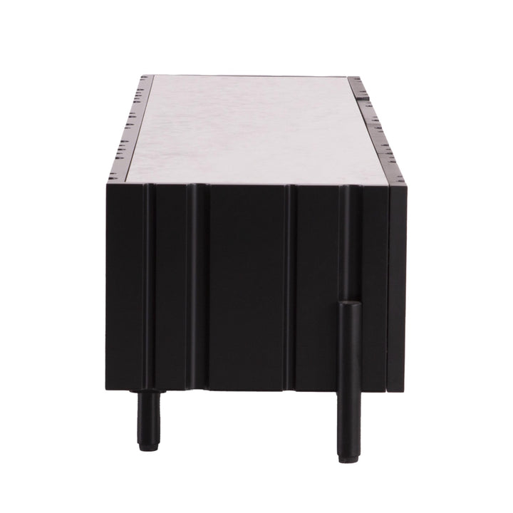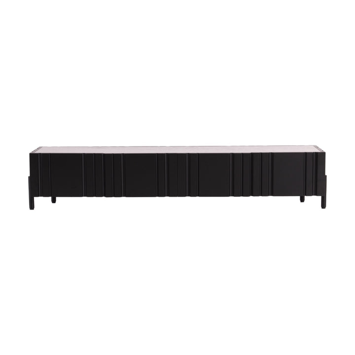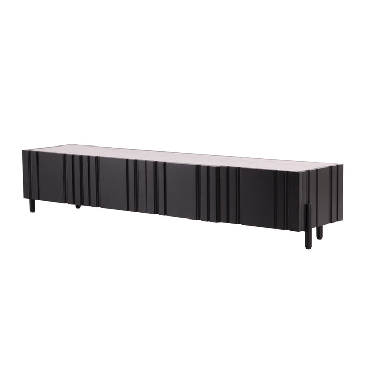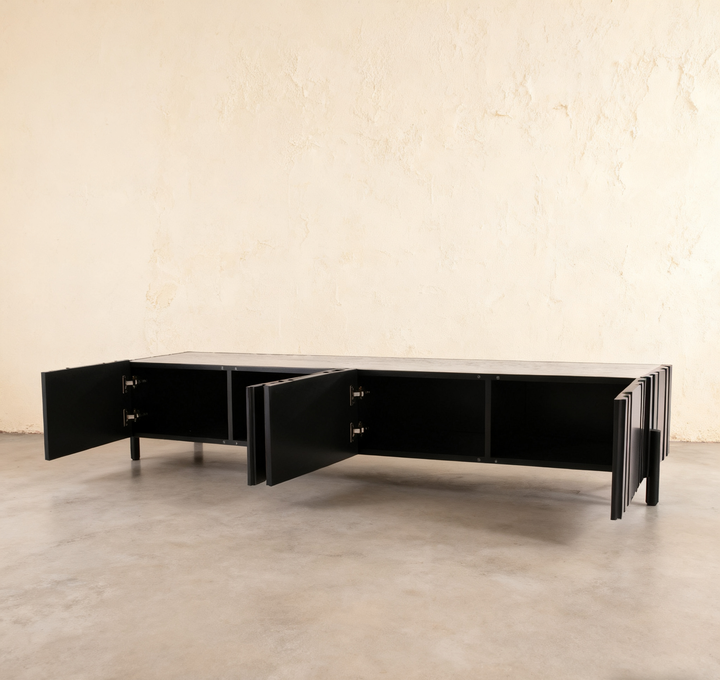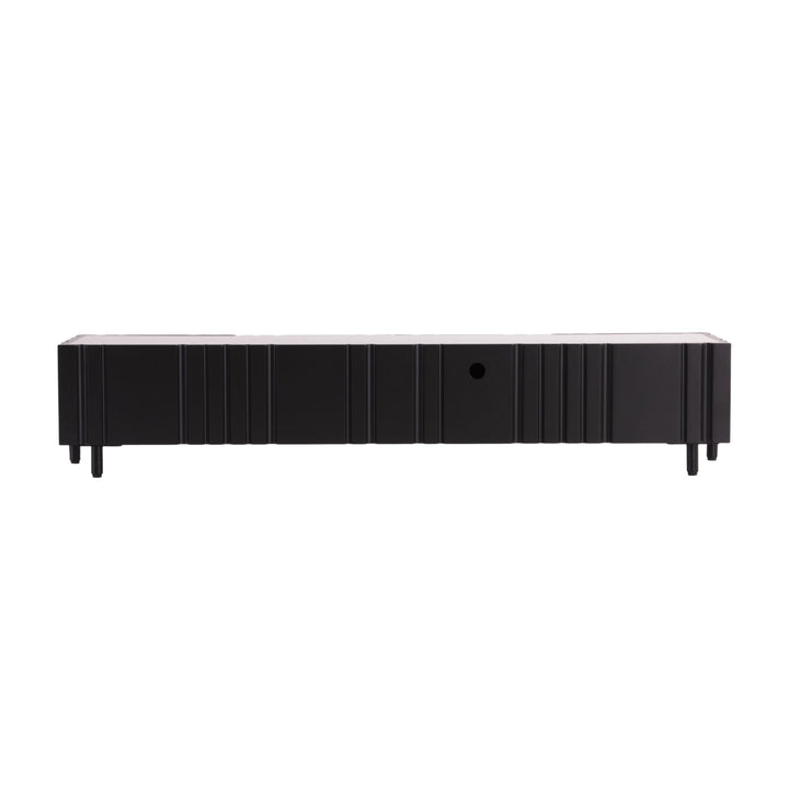 This modern TV cabinet features an E1-grade high-density grooved board with a sleek solid-color lacquer finish for a clean, contemporary look. Topped with a 6mm thick crystal gray slate and supported by sturdy carbon steel legs, it blends elegance, durability, and industrial style—perfect for sophisticated living spaces.