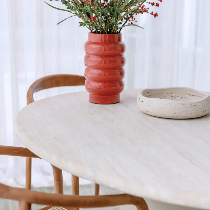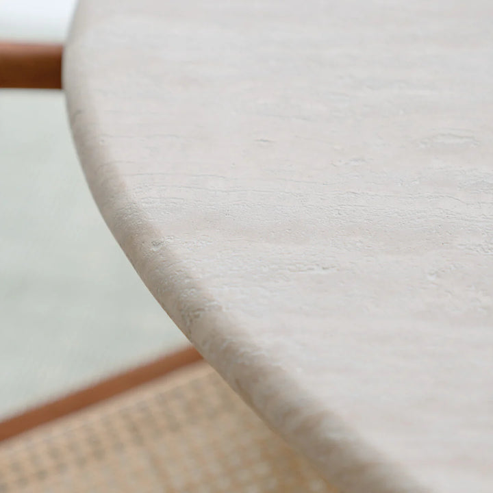 Bring elegance and natural beauty to your interior with the Reef Dining Table. This exclusive table combines a refined white travertine top, half-filled for a subtle texture and luxurious look. The top rests on a sturdy Latte StoneSkin leg with a depth of 40 cm, which not only provides stability but also adds a modern, stylish look to your dining space.