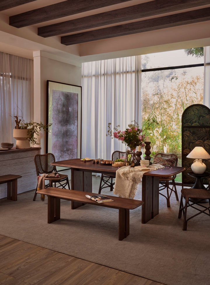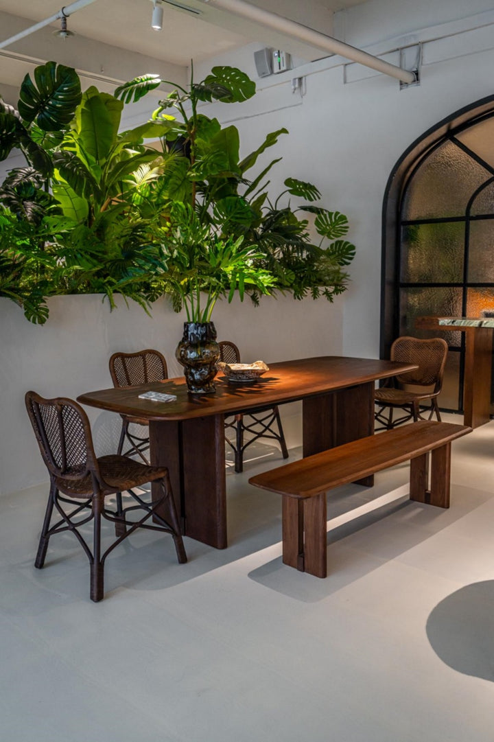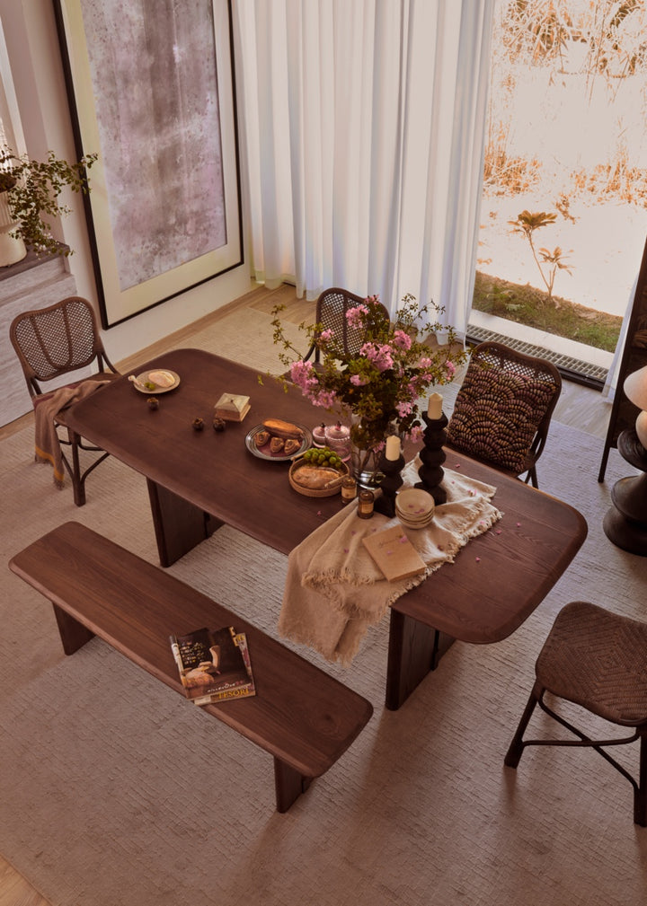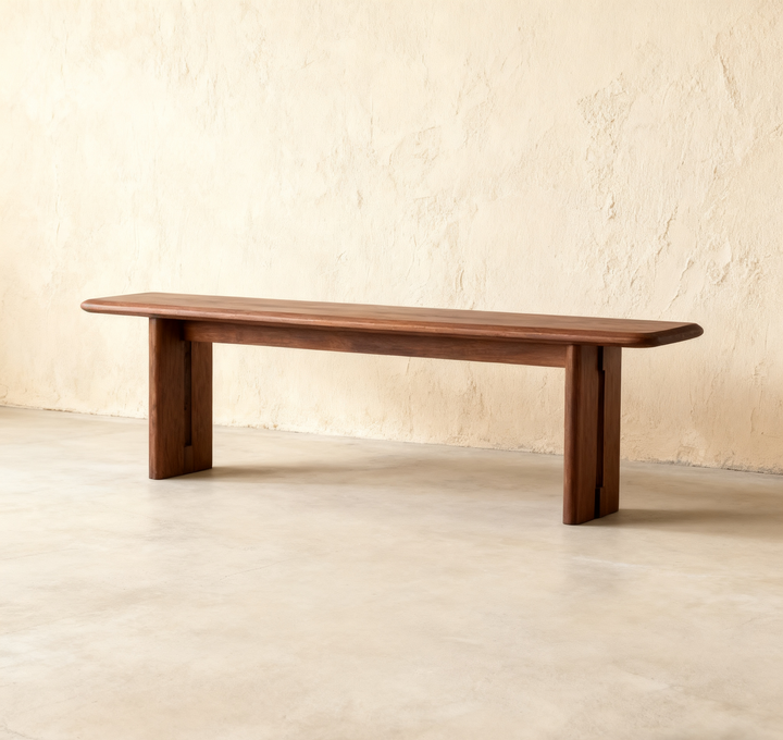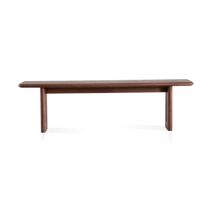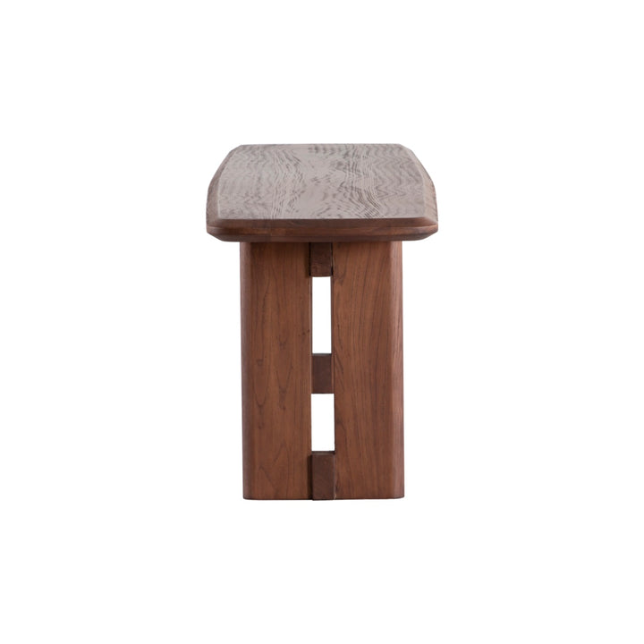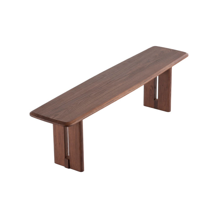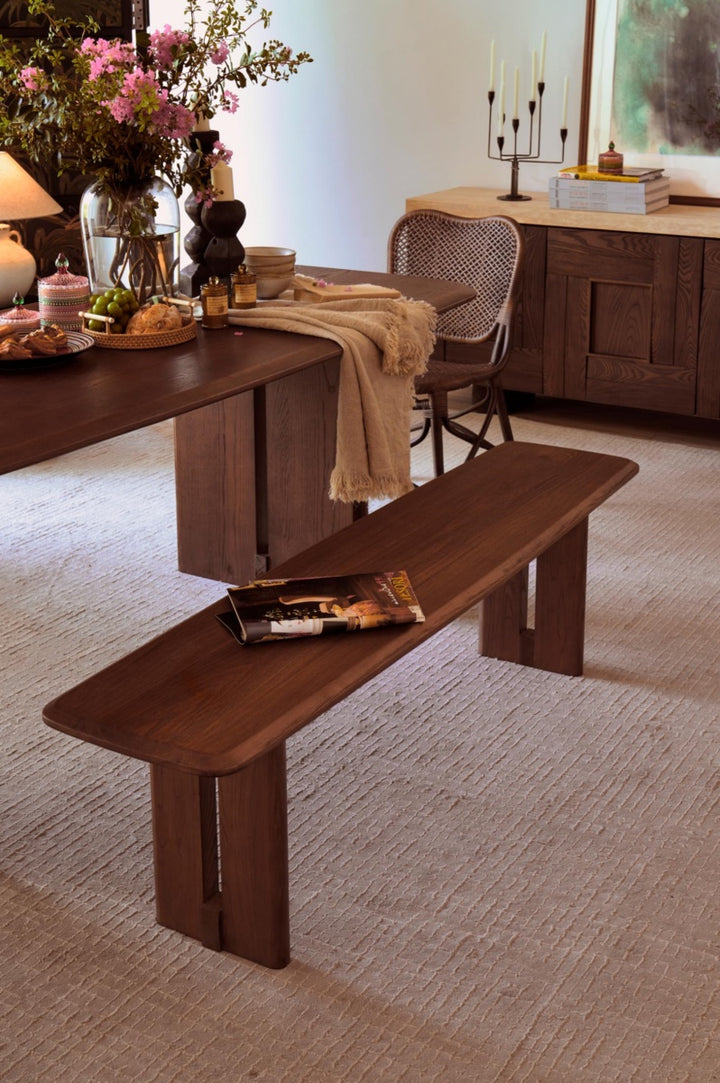This dining bench is crafted from weathered elm wood, finished in a rich walnut tone that highlights its natural grain and rustic charm. The sturdy construction ensures lasting durability, while the minimalist design adds timeless appeal. Perfect for pairing with dining tables or as versatile seating in any living space.